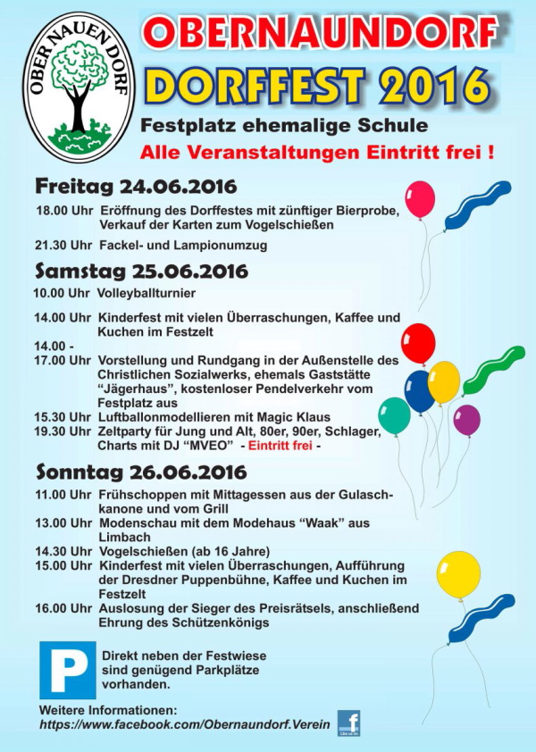 Auch in 2016 gibt es wieder ein Dorffest in Obernaundorf. Dieses findet statt vom 24. - 26.06.2016. Link zur Facebook-Seite.